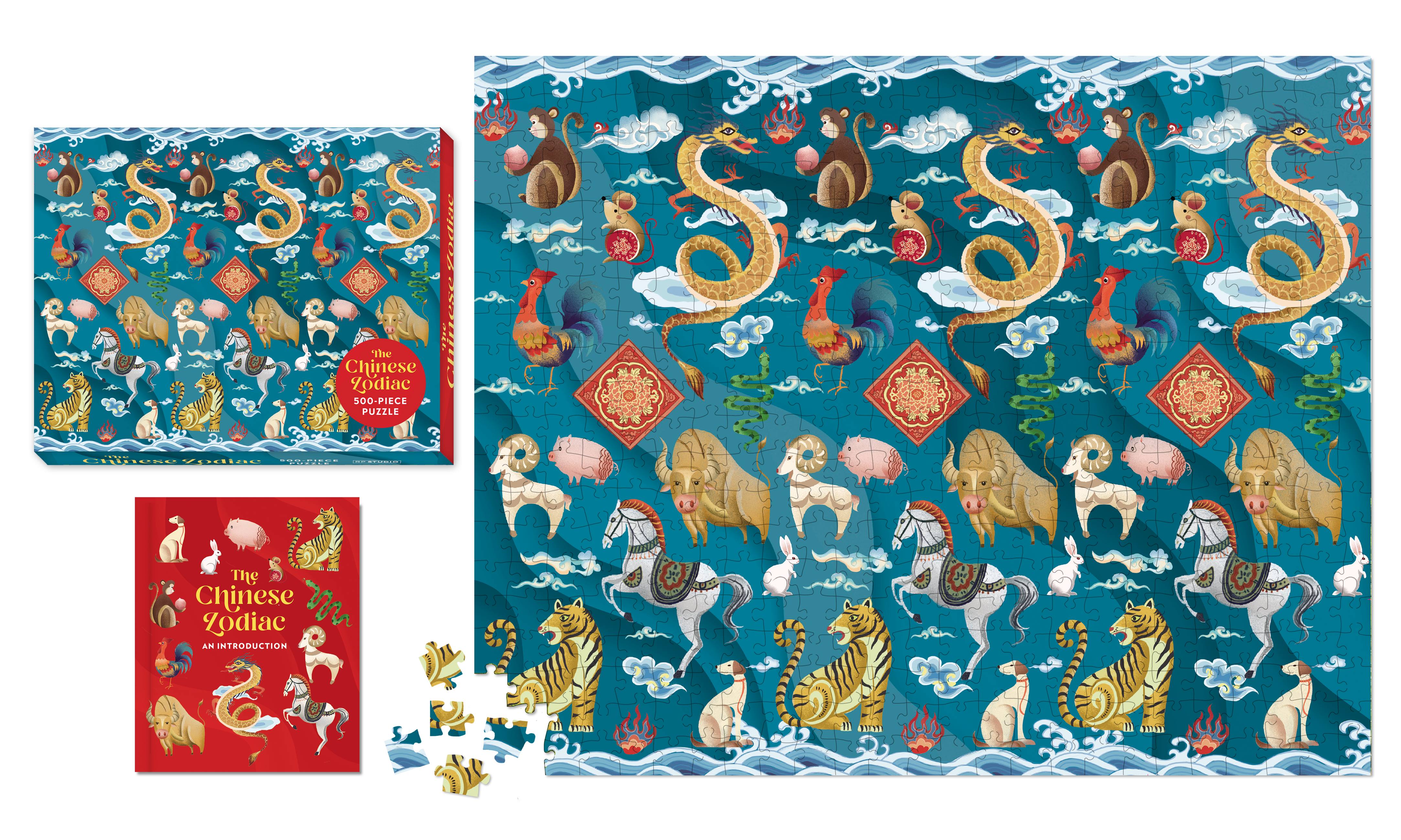 Explore the Chinese zodiac with this fully illustrated 500-piece puzzle and book set, featuring beautiful illustrations of the 12 animal horoscopes.
