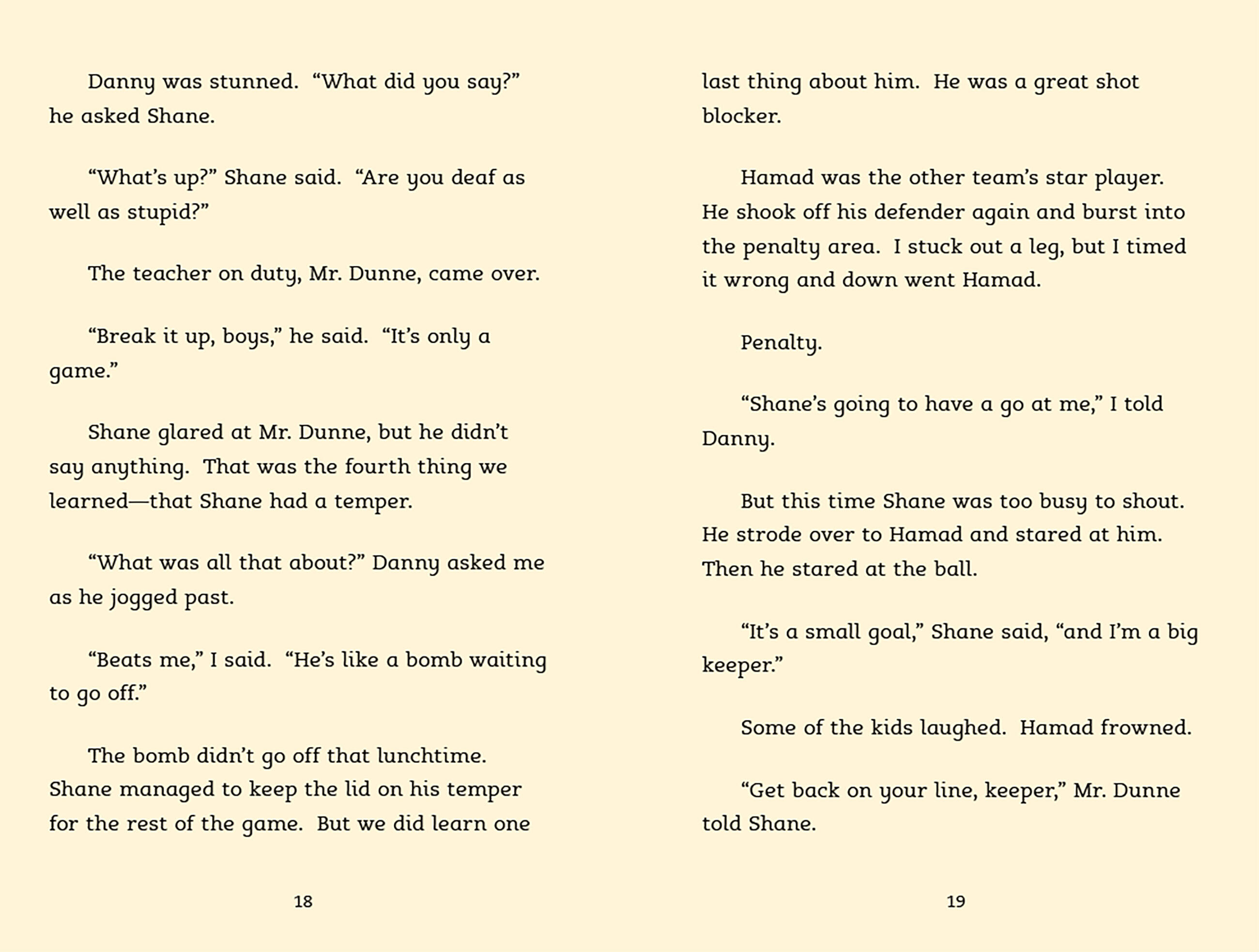 The North Star soccer team is thrilled when Shane, the new boy at school, turns out to be a talented goalkeeper. But Shane has a temper that gets him in trouble and a demanding father who acts out on the sidelines at every game. Soon Shane’s teammates start to worry that something is really wrong—and that Shane’s not nearly as tough as he seems.