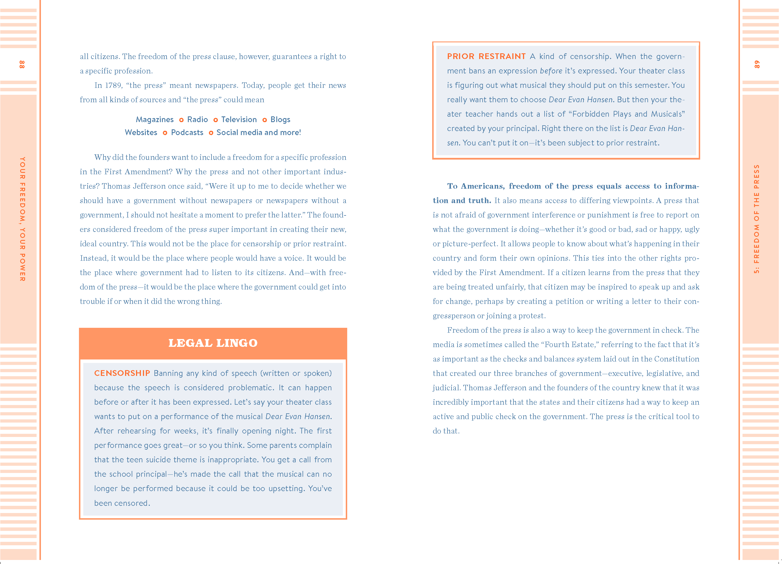 The First Amendment grants kids and every other citizen five monster privileges: freedom of religion, freedom of speech, freedom of the press,