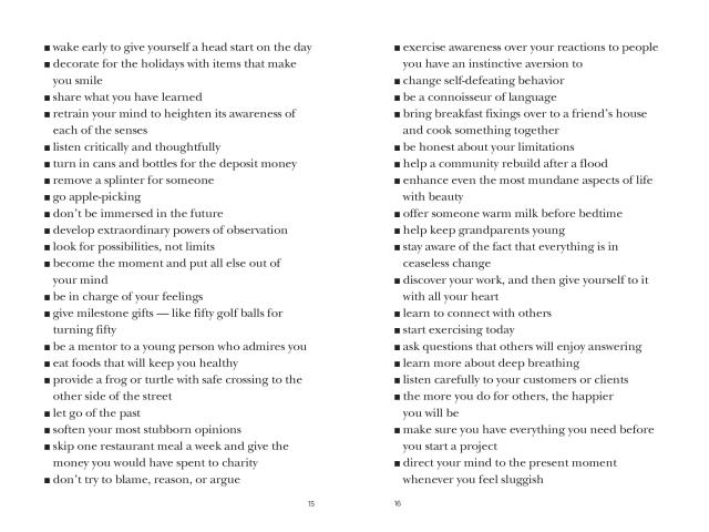 Created by Barbara Ann Kipfer, the author whose books-including 14,000 Things to Be Happy About, 8,789 Words of Wisdom, and The Wish List-have 1.2 million copies in print, Instant Karma is a compulsive, densely packed, chunky little book of 10,000 or so suggestions, wishes, thoughts, and the occasional heartening quotation.
