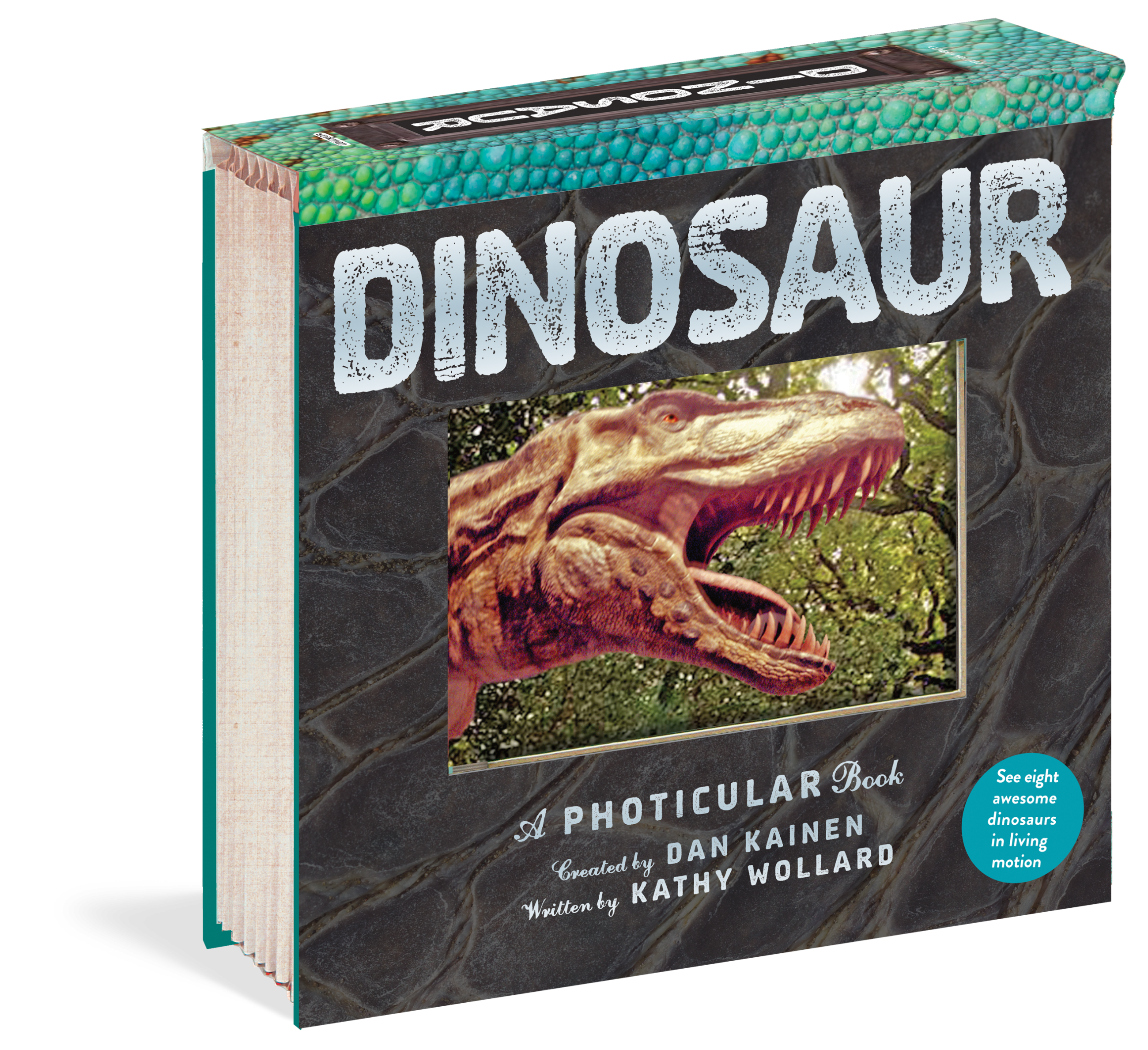 Using Photicular technology—an innovative lenticular-based technology that uses precision sliding lenses and four-color video imagery—each image is like a 3D movie on the page, delivering a rich, fluid, immersive visual experience, bringing these legendary, long-extinct creatures to life. The result is breathtaking. There’s a herd of giant sauroposeidons, with their impossibly long necks, lumbering across the sun-drenched plains, a threatened velociraptor waving its wildly feathered arms, and more.