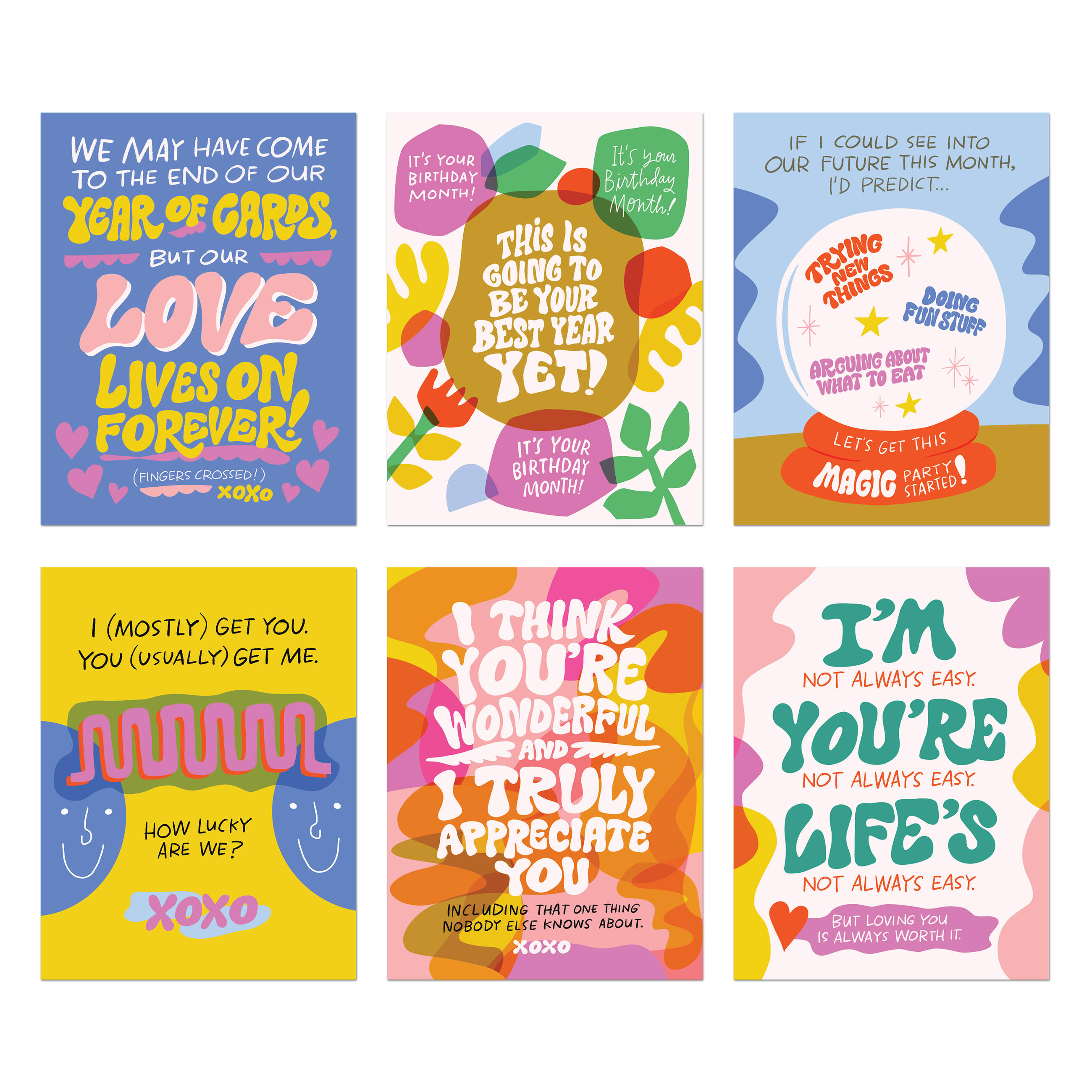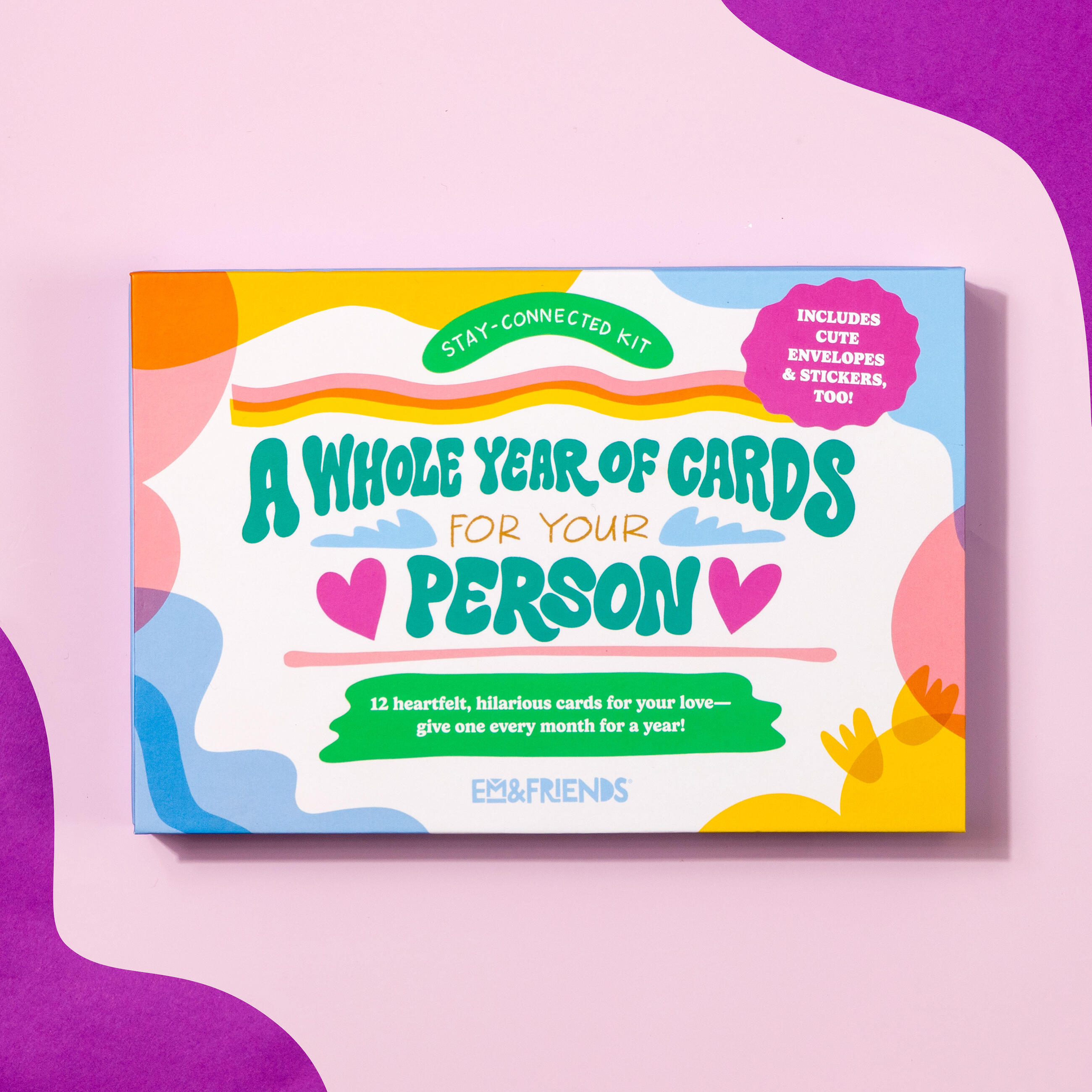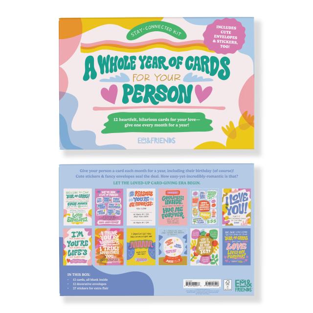 Finding ways to surprise and delight Your Person can be a challenge. Let us take care of it for you! Our new greeting cards boxed set supplies one card a month from you to your special boo (are people still saying boo?), including a birthday card!. Cute stickers make sealing the deal even sweeter. You can start sending the cards at any time.