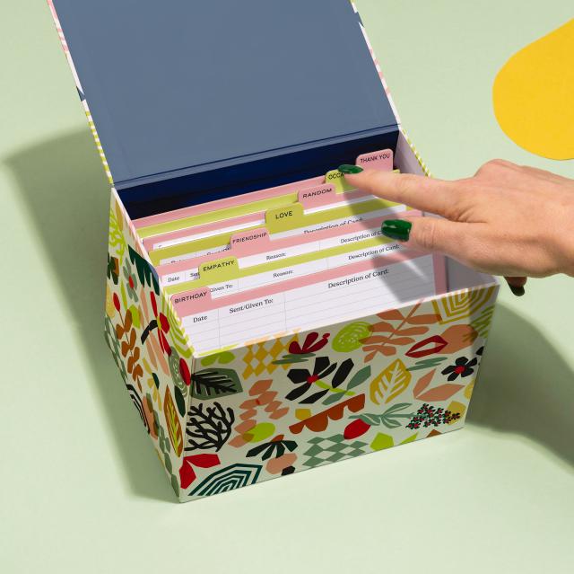 Hey, card lover! We created a box that’s like a file organizer for your cards, keeping ’em organized & safe from coffee spills & cat paws. Besides being cute and sturdy, it’s roomy enough for 60+ cards—and comes stocked with 6 EMF greeting cards! Plus it’s got stickers, tabbed dividers, and a calendar for important dates! OH YEAH, plus an address keeper, trackers to log cards you’ve sent, and tips for writing cards! Did we forget anything? Hmmmmmm… Well, it doesn’t come with a nice warm mug of tea. We thought it might spill.