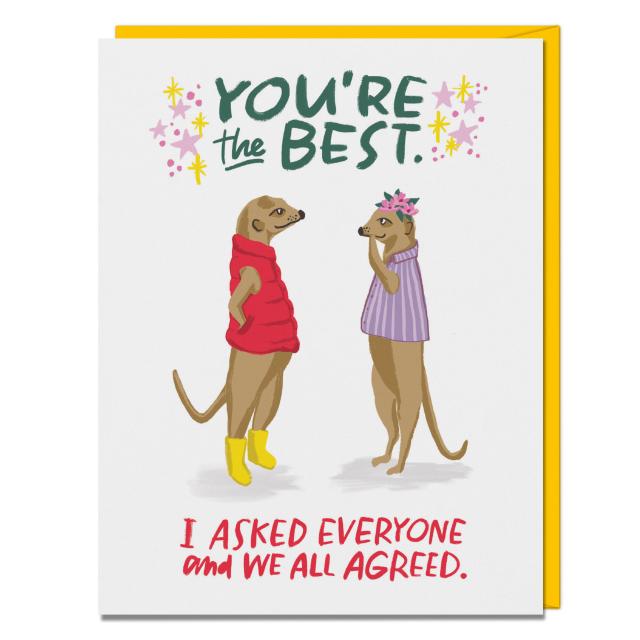 This card is a definite crowd-pleaser—partly because of the meerkats in lil’ outfits, and partly because it works for so many occasions: birthday, thank-you, congratulations, “just because,” National Thank-a-Mail-Carrier Day (Feb. 4!) … we could go on.