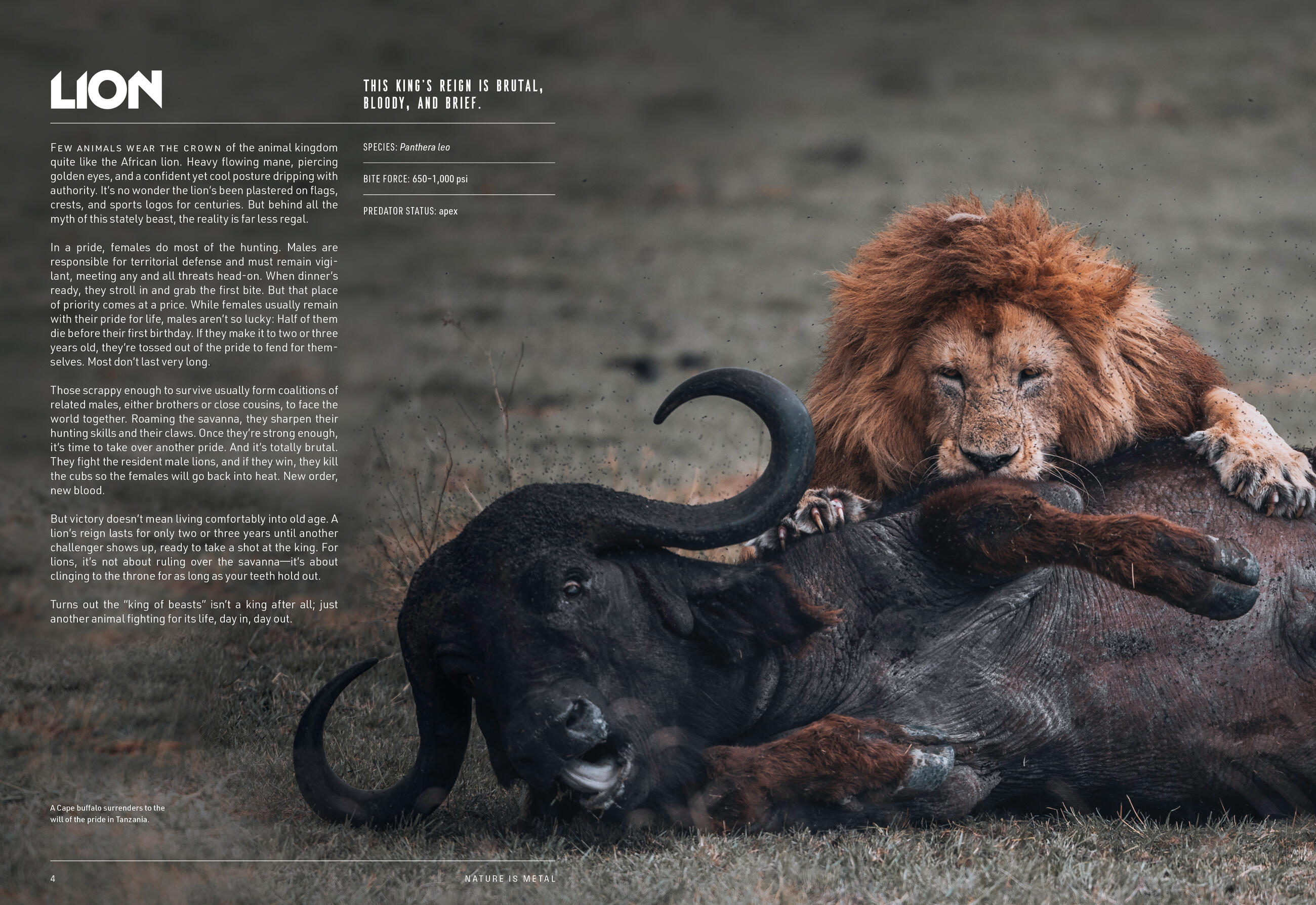 From the viral Instagram account @natureismetal, discover the most badass animals on the planet with this no-holds-barred celebration of nature at its most head-bangingly metal. Packed with dramatic—and utterly brutal—photographs and eye-popping biological info on more than 75 species that are not to be messed with, Nature Is Metal is a raw and unforgiving celebration of deadly hunting techniques, ingenious survival tactics, and much more.