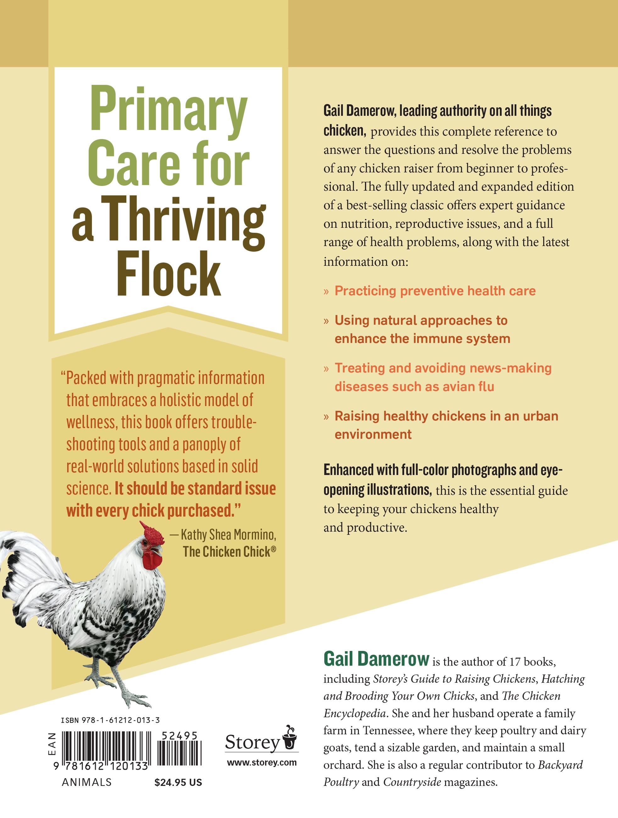 “Twenty years ago, I got my first hen and turned to The Chicken Health Handbook for answers. Today, Damerow’s work continues to provide sound counsel. This new edition — based in solid science, detailed and comprehensive — is an accessible and practical guide for anyone who has chickens.”
