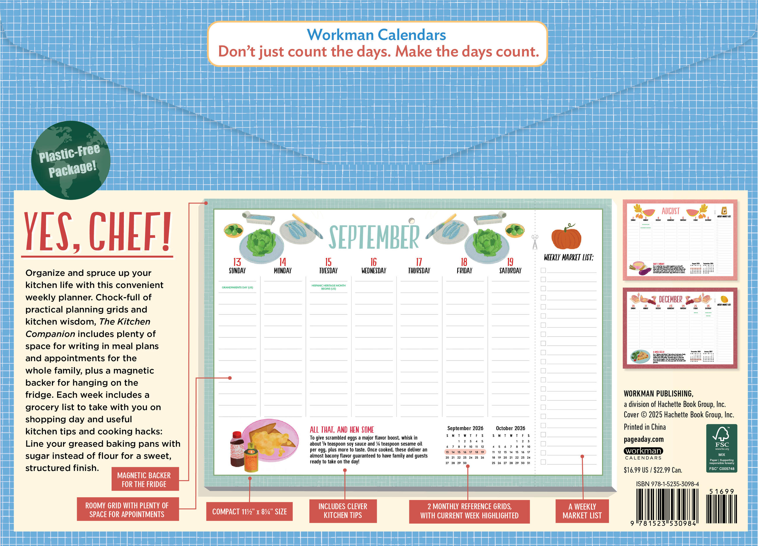 - THE ULTIMATE KITCHEN CALENDAR: Includes space for your grocery list, clever kitchen tips, and charming food-themed illustrations to cheer up your meal planning.