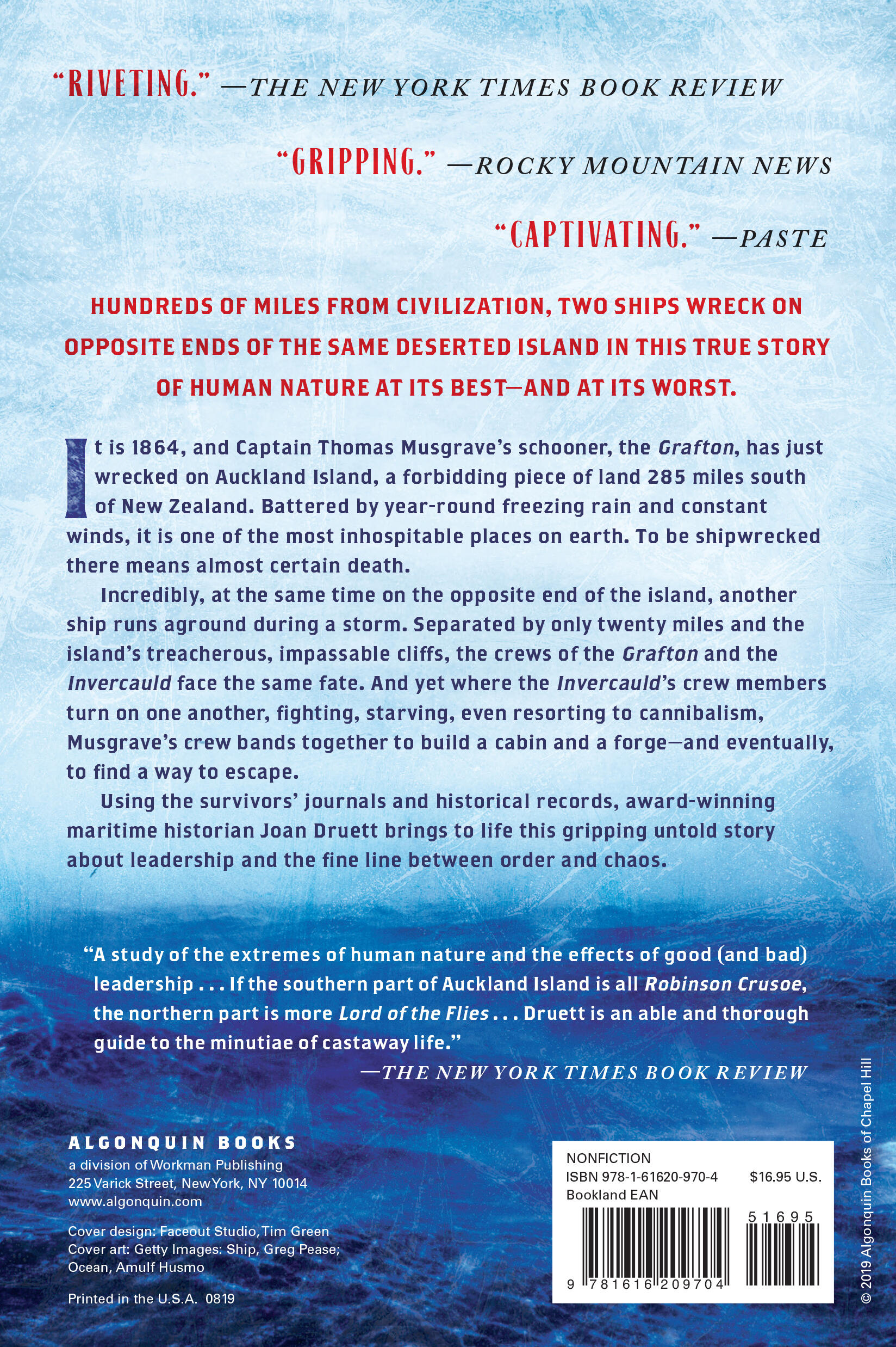 “If the southern part of Auckland Island is all Robinson Crusoe, the northern part is more Lord of the Flies . . . Druett is an able and thorough guide . . . [She] shows that real leadership is rare and powerful.” I>The New York Times Book Review