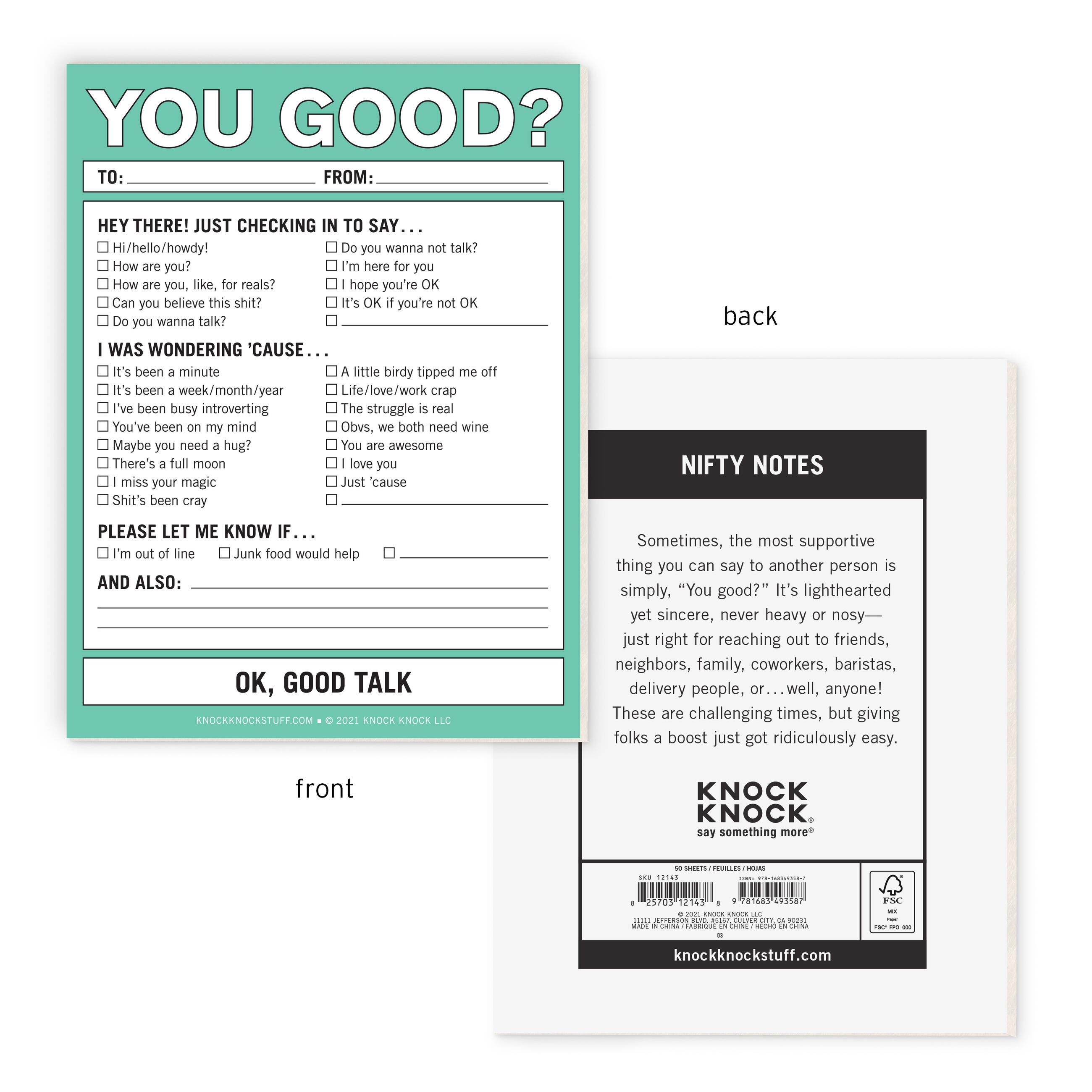 Sometimes, the most supportive thing you can say to another person is simply, “You good?” It’s lighthearted yet sincere, never heavy or nosy— just right for reaching out to friends, neighbors, family, coworkers, baristas, delivery people, or…well, anyone!