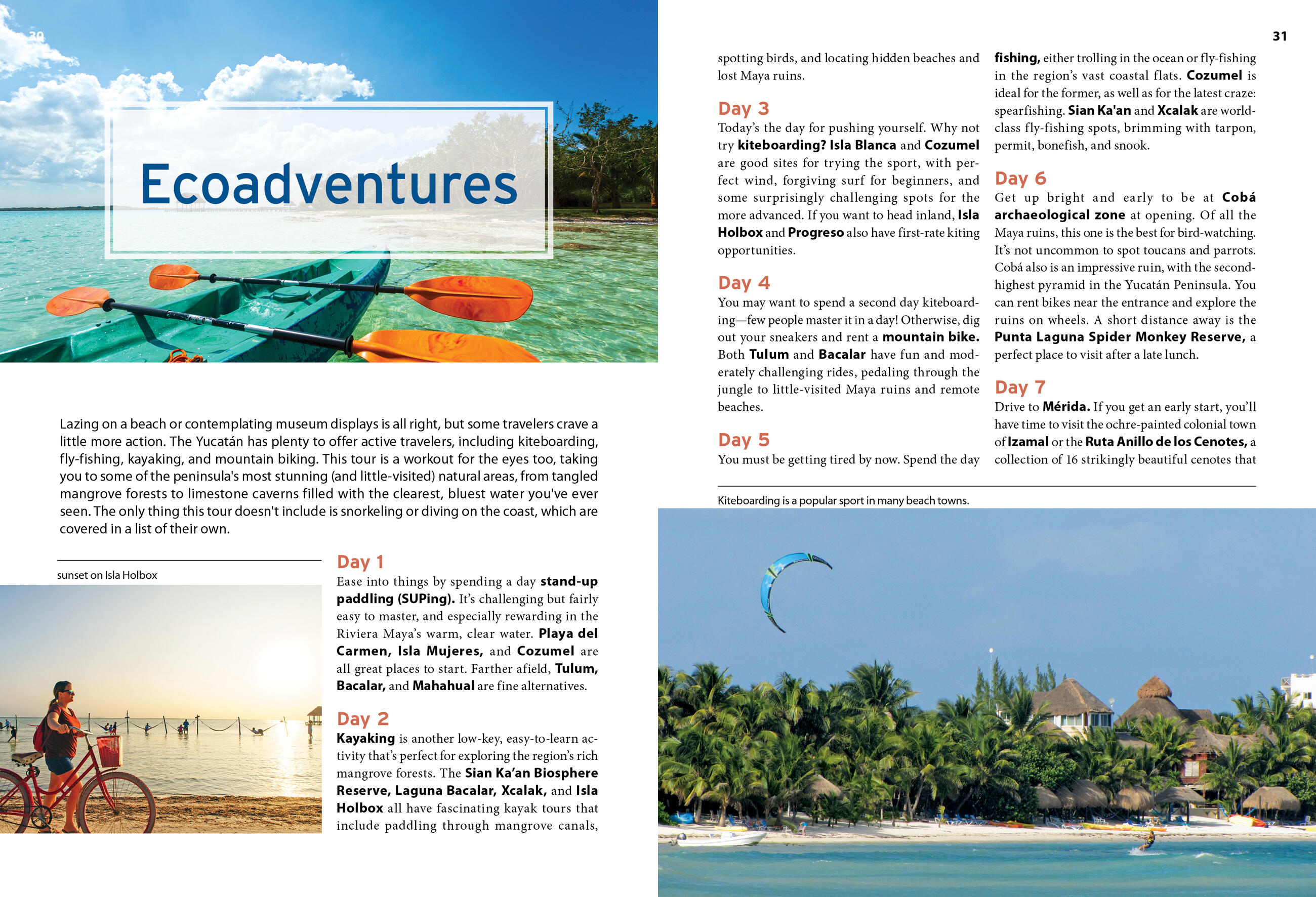 - The top outdoor activities: Kayak through lush mangrove forests, or sign up for a mountain bike tour through the jungle for a peek at hidden ruins, remote beaches, and dazzling marine life. Spend a day relaxing on the beach, dive into crystal-clear cenotes, or try standup paddle-boarding