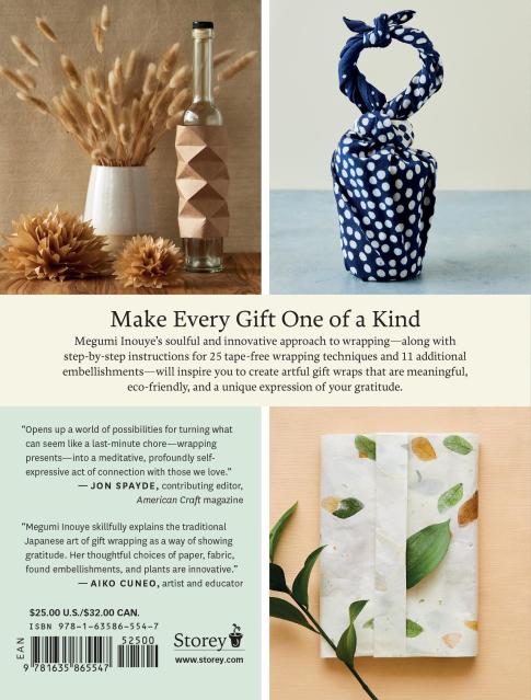 “Megumi’s book is not just about gift-wrapping. She takes us on a journey that includes learning about materials and techniques while explaining how gratifying the thoughtful enclosure of a gift can be—to both the giver and receiver. She skillfully shares her life experiences and explains the traditional Japanese art of gift wrapping as an important way of showing gratitude. Her thoughtful choices of paper, fabric, found embellishments, and plants are innovative and demonstrate elegant simplicity. Megumi encourages repurposing, discovery, and our unique artistic expression in how we choose to enclose our gifts to each other. After reading her book, you will look at wrapping gifts in a whole new, meaningful way.”Aiko Cuneo, artist and educator