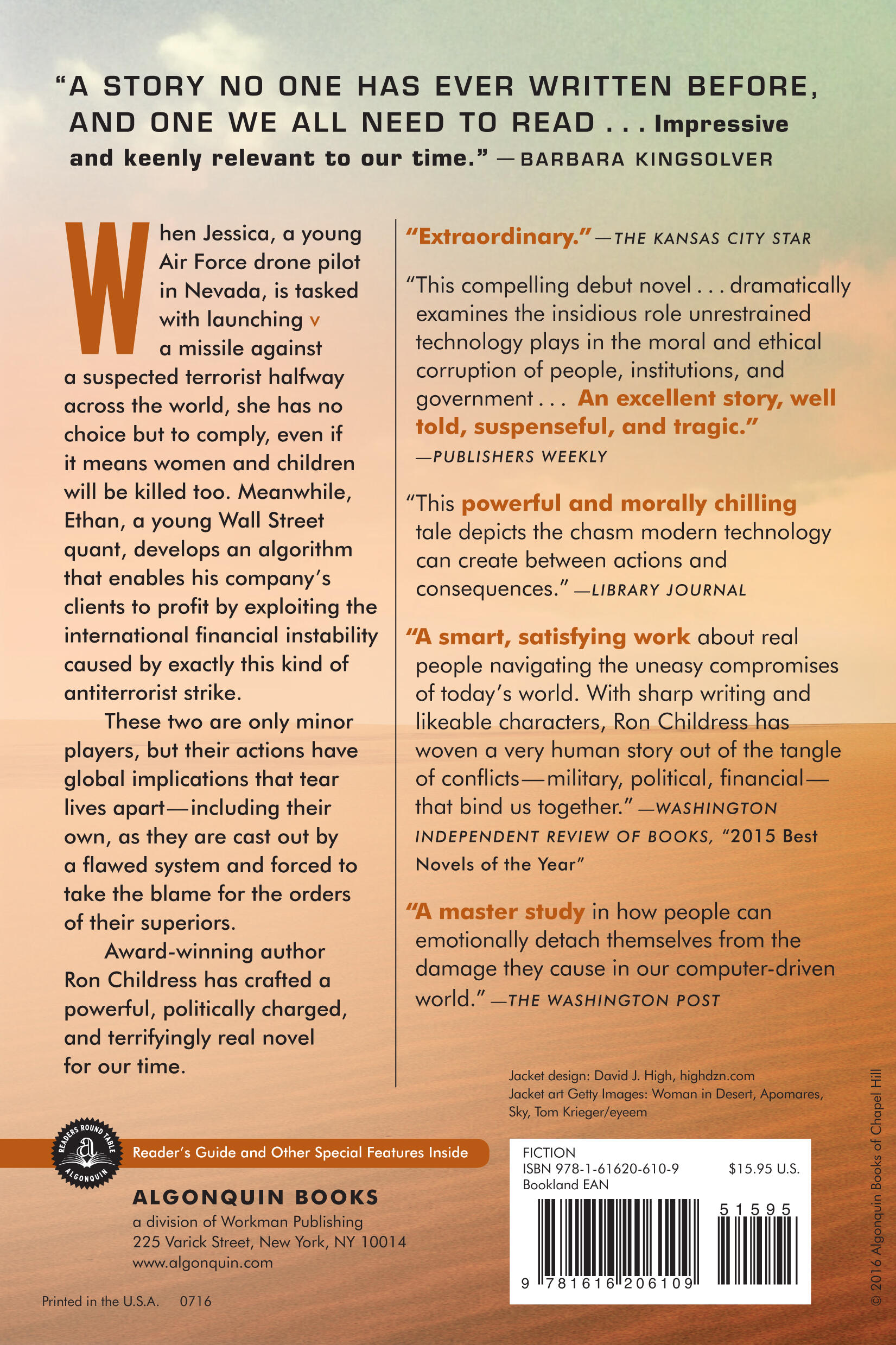 “A smart, satisfying work about real people navigating the uneasy compromises of today’s world. With sharp writing and likeable characters, Ron Childress has woven a very human story out of the tangle of conflicts–military, political, financial–that bind us together.” —Washington Independent Review of Books, “2015 Best Novels of the Year”