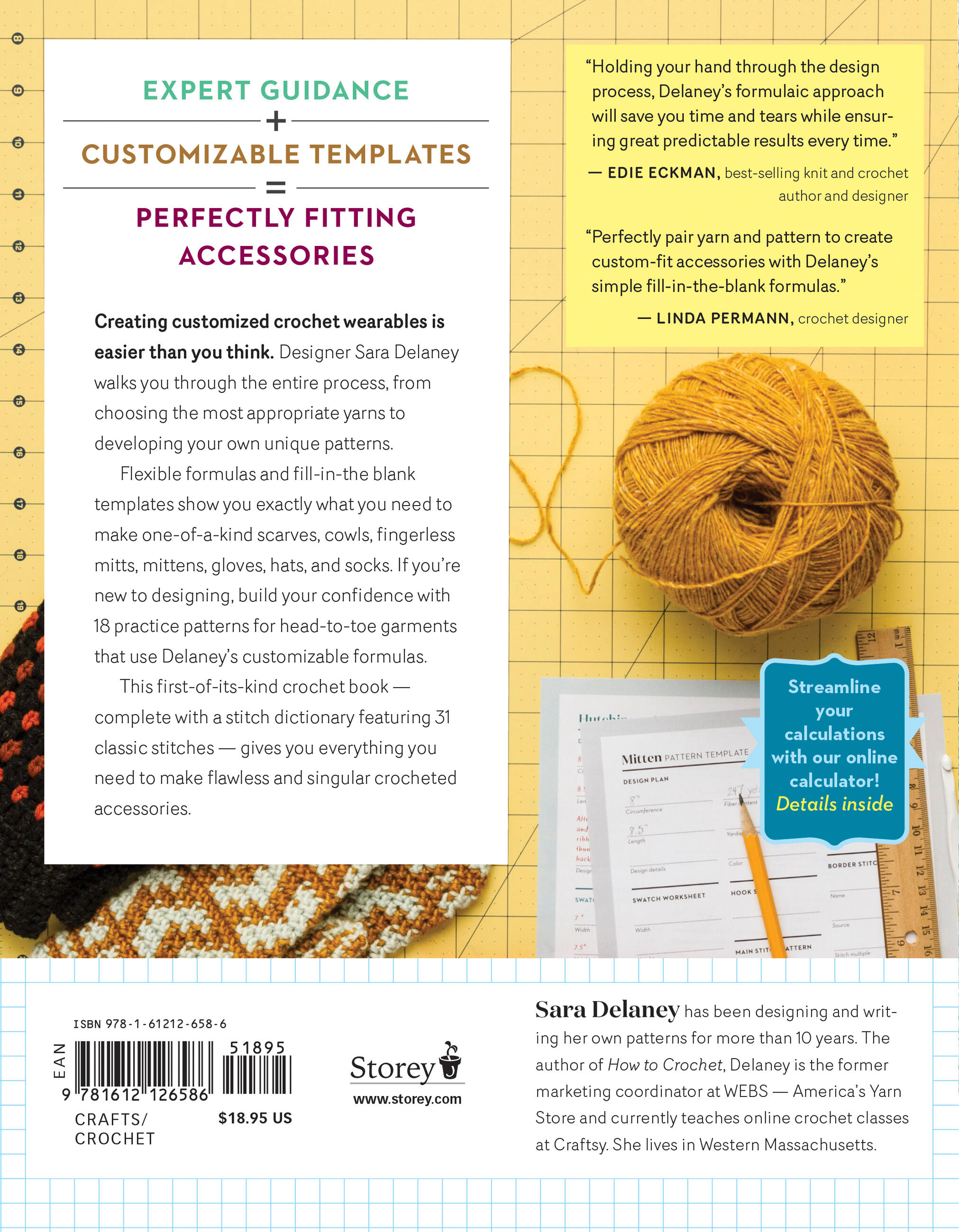 “Whether you are newly tip-toeing into design or are experienced in the try-and-try-again design method, Delaney’s formulaic approach will save you time and tears while ensuring great predictable results every time.” — Edie Eckman, best-selling knit and crochet author and designer “Perfectly pair yarn and pattern to create custom-fit accessories with Delaney’s simple fill-in-the-blank formulas. If you just want to crochet, 18 classic designs show the formulas in action.” — Linda Permann, crochet designer