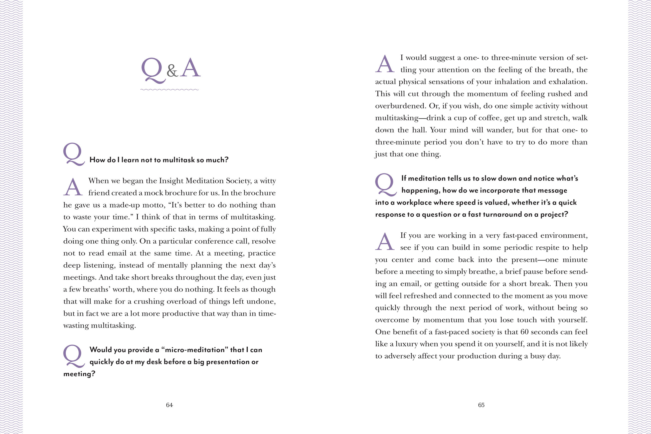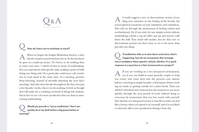 Includes specific meditations designed for workplace issues, “steal meditations that take moments to do and are invisible to office mates, and dozens of exercises, plus helpful Q&As. Includes free downloadable guided meditations.