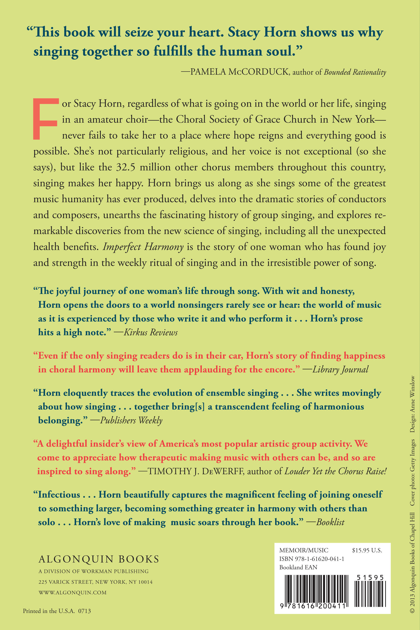 For Stacy Horn, regardless of what is going on in the world or her life, singing in an amateur choir—the Choral Society of Grace Church in New York—never fails to take her to a place where hope reigns and everything good is possible. She’s not particularly religious, and her voice is not exceptional (so she says), but like the 32.5 million other chorus members throughout this country, singing makes her happy. Horn brings us along as she sings some of the greatest music humanity has ever produced, delves into the dramatic stories of conductors and composers, unearths the fascinating history of group singing, and explores remarkable discoveries from the new science of singing, including all the unexpected health benefits. Imperfect Harmony is the story of one woman who has found joy and strength in the weekly ritual of singing and in the irresistible power of song.