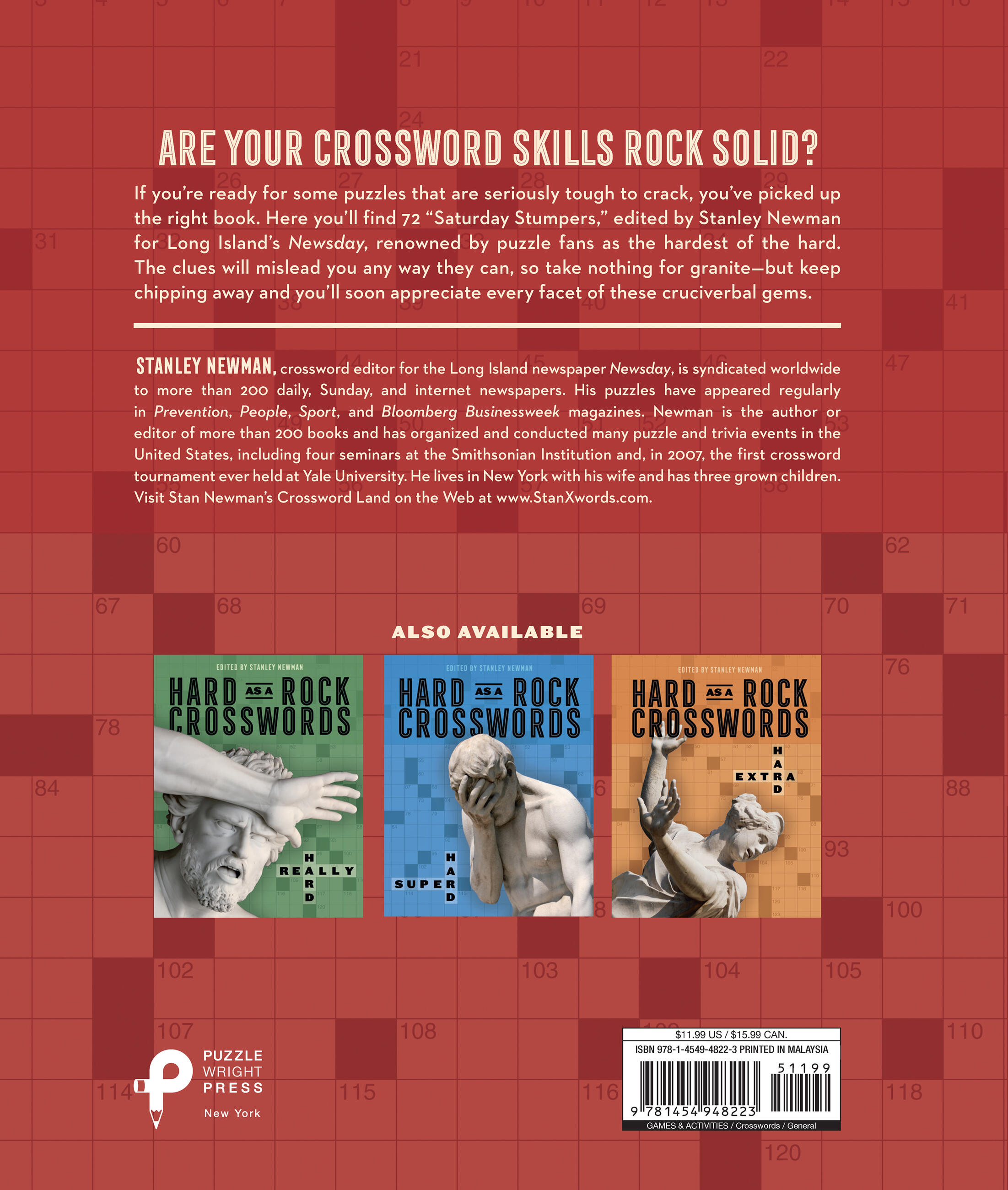 Everyone looks forward to Saturday, but for some of us, it’s not just because it’s the weekend—it’s when the newspapers publish their hardest crosswords. Hard as a Rock Crosswords: Quite Hard Indeed! features the hardest of the hard, with some of the twistiest, most fiendishly misleading clues you’ll ever have the pleasure of tearing your hair out over. This 96-page puzzle book features 72 themeless 15×15 crosswords from some of the top puzzle makers in the country, with wide-open diagrams that will make you wonder “How did they even make this?” Expert solvers will love the challenge, and those who want to become expert solvers will enjoy the opportunity to hone their skills. And if the puzzles ever make you feel at a loss for words, the answers are always in the back.