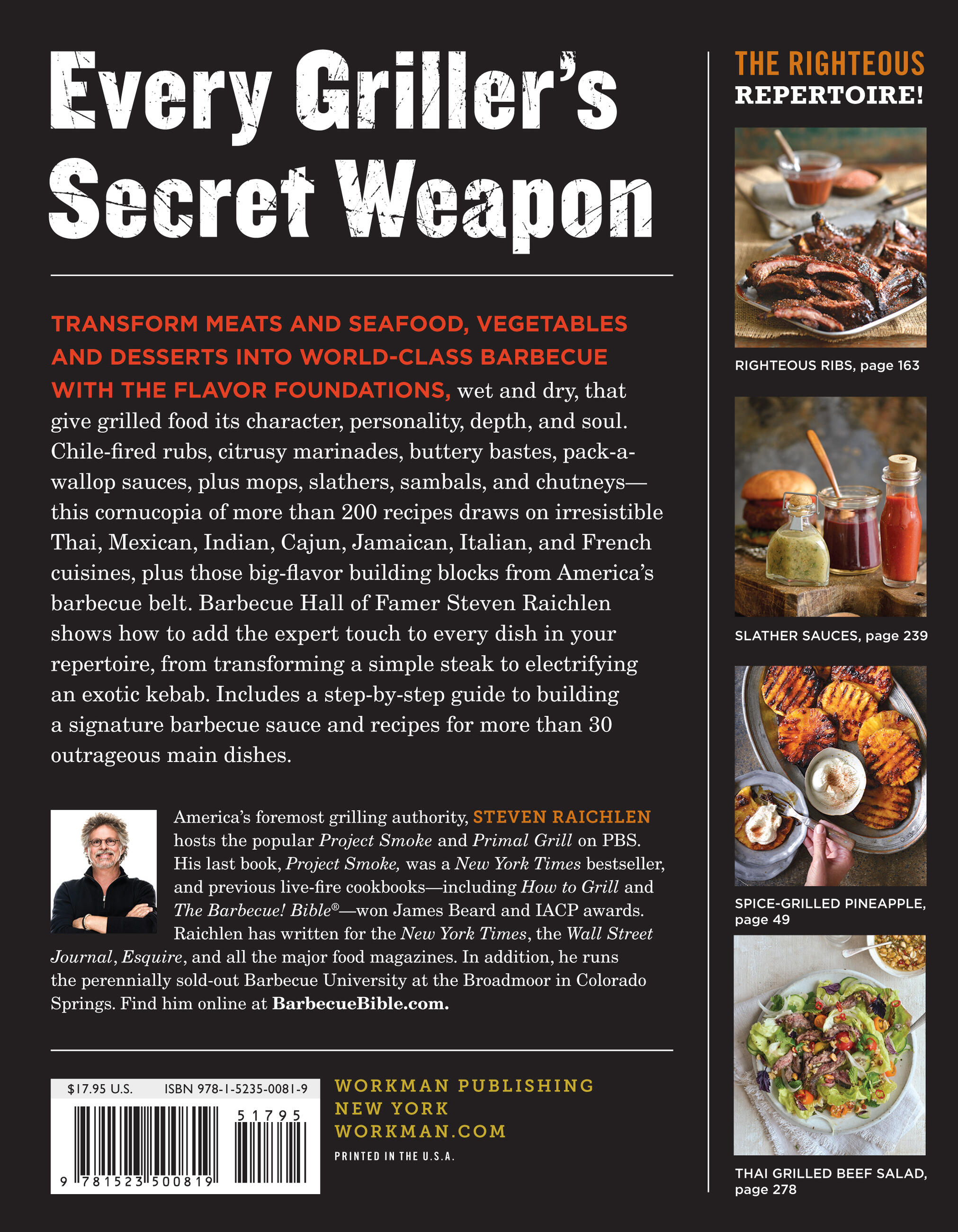 Transform meats and seafood, vegetables and desserts into world-class barbecue with the flavor foundations that give grilled food its depth, and soul. Chile-fired rubs, citrusy marinades, buttery bastes, pack-a-wallop sauces, plus mops, slaters, sambals, and chutneys—this cornucopia of more than 200 recipes draws on irresistible Thai, Mexican, Indian, Cajun, Jamaican, Italian, and French cuisines, plus those big flavor building blocks from America’s barbecue belt.