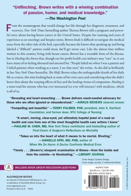 “A stunning book that helped me understand how to survive a serious illness and how to understand hospitals in general. Theresa Brown is also a hell of a good writer.”Library Journal“Healing should be read by everyone, not just those facing cancer. Brown experiences both grief and revelation, and the beauty of her book is that we learn so much about hope and fear and coping, about living and dying and everything in between.”—Bobbie Berkowitz, PhD, RN, FAAN, Emeritus Dean, Columbia University School of Nursing “By relating her own intimate experiences with cancer, Brown provides a candid critique of a system that sometimes fails people when they are most vulnerable. A brave and rare book that advocates for greater compassion in healthcare.”—Pamela F. Cipriano, PhD, RN, FAAN, Dean, University of Virginia School of Nursing “Riveting and wrenching, Theresa Brown’s memoir takes us into the heart of what it means to be mortal. Examining illness from the inside and the outside, Brown’s sure hand provides a clear-eyed narrative that’s both intimate and harrowing.”—Danielle Ofri, MD, PhD, editor of Bellevue Literary Review and author of When We Do Harm: A Doctor Confronts Medical Error “A compelling and beautiful book. Brown’s personal depth in her narrative and remarkable tie-ins across many facets of history and literature draw the reader in and make it clear how much work we have to do in healthcare to get to reliable, humane practices.”—Terry Fulmer, PhD, President, John A. Hartford Foundation, former Dean, NYU College of Nursing “In her wide-ranging examination of fear, illness, and life in what she calls ‘cancer’s shadow,’ Brown never fails to reveal her own humanity. Healing is a book not only for breast cancer patients and their loved ones, but for anyone else who cares about caring. Most importantly, Brown shows us the importance of perspective: how the value of compassion becomes infinitely greater when it becomes your own life that needs saving.”—Chicago Review of BooksPraise for The Shift: “An engrossing human drama . . . The Shift is one nurse's story, but it contains elements of every nurse's experience." –The Wall Street Journal “The Shift . . . should be required reading for all incoming medical and nursing students--or anyone who is a patient or visitor in a hospital . . . Her story is riveting in the exacting way she recounts the way her day unfolds.” –Pittsburgh Post-Gazette “Brown does an excellent job of taking us moment by moment through her day . . . keeping the narrative flowing. The reader feels her affection and deep sense of responsibility for her patients." –Minneapolis Star-Tribune