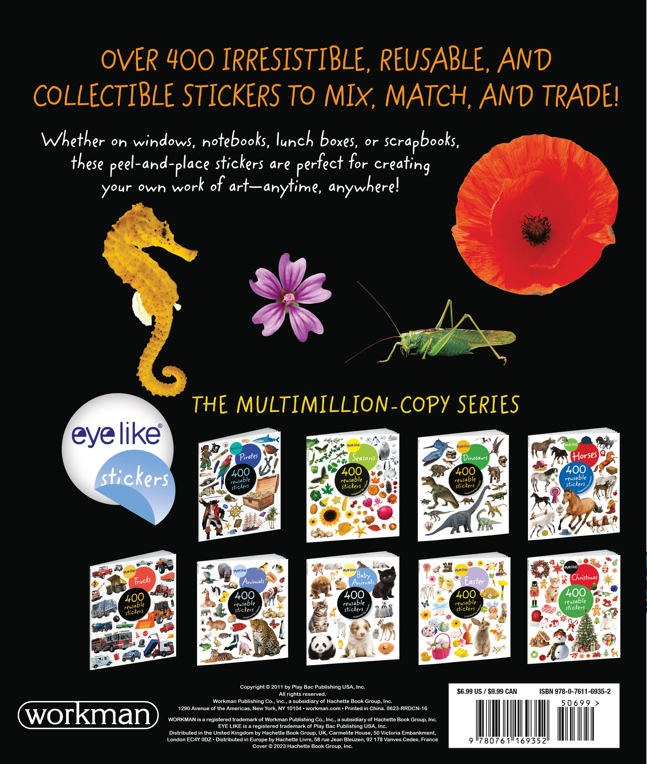 Containing stickers in every color of the rainbow, each page is full of vibrant, photorealistic images sorted by color (orange is for tigers, clownfish, pumpkins, parrots, and carrots!). Whether on windows, notebooks, lunch boxes, or scrapbooks, these peel-and-place stickers are perfect for creating your own work of art anytime, anywhere, and are designed to be stuck on, peeled off, and stuck on again without tearing or losing their “stick.” The books’ inside covers are glossy illustrated backgrounds on which kids can create lively and original sticker scenes―and then change them whenever they like.