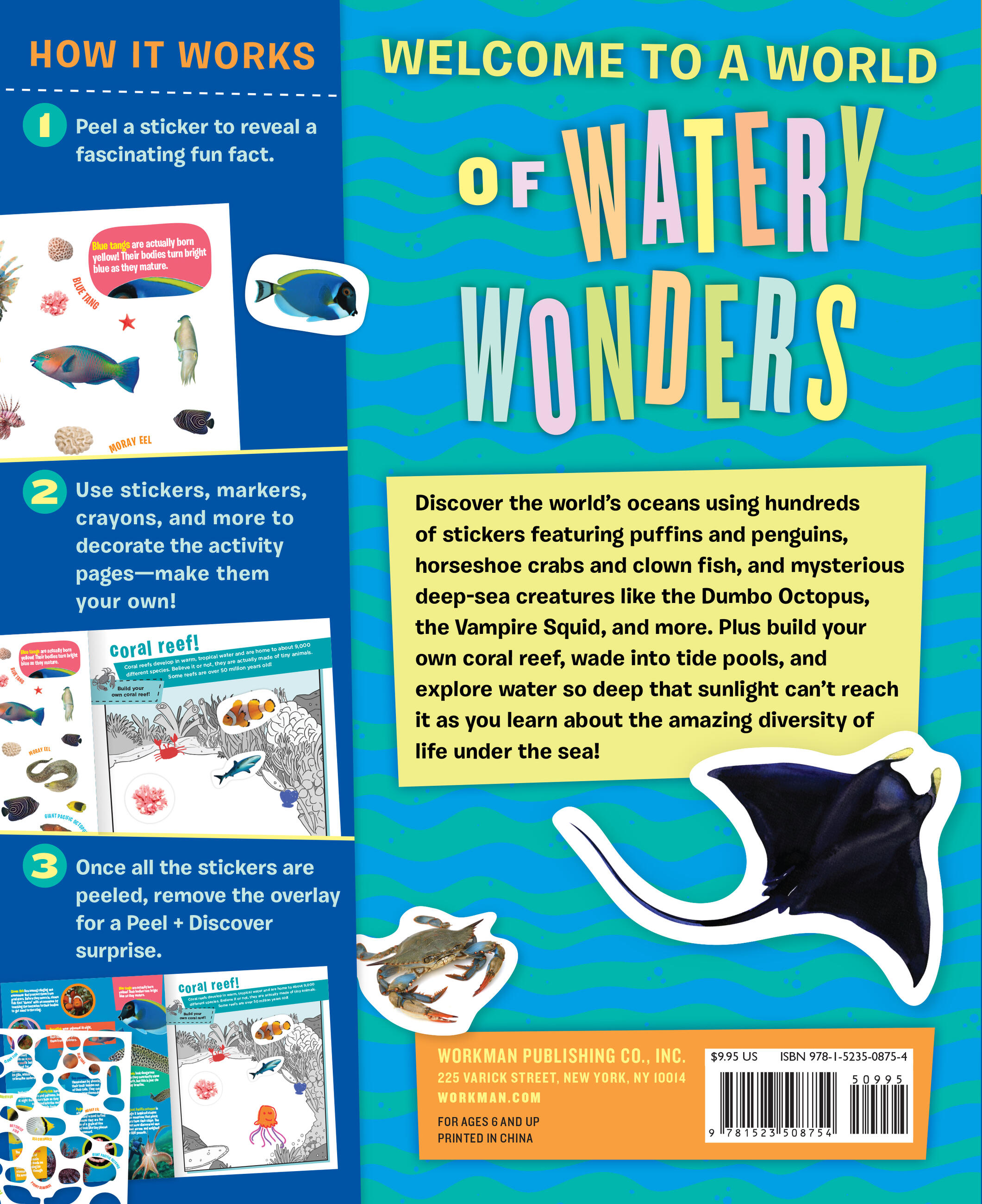 Discover the world’s oceans using hundreds of stickers featuring puffins and penguins, horseshoe crabs and clown fish, and mysterious deep-sea creatures like the Dumbo Octopus, the Vampire Squid, and more. Plus build your own coral reef, wade into tide pools, and explore water so deep that sunlight can’t reach it as you learn about the amazing diversity of life under the sea.
